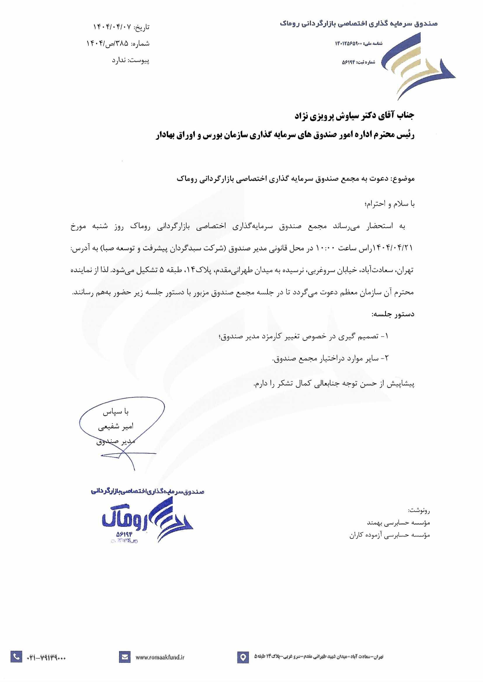 صورتجلسه مجمع سالانه صندوق سرمایه گذاری اختصاصی بازارگردانی روماک مورخ ۱۴۰۴/۰۶/۲۵